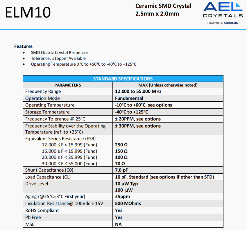| ELM10-16.000MHz-8-R60-2-D20-T | AEL Crystals | ELM10 | 16 MHz | ±20ppm | ±20ppm | 8 pF |