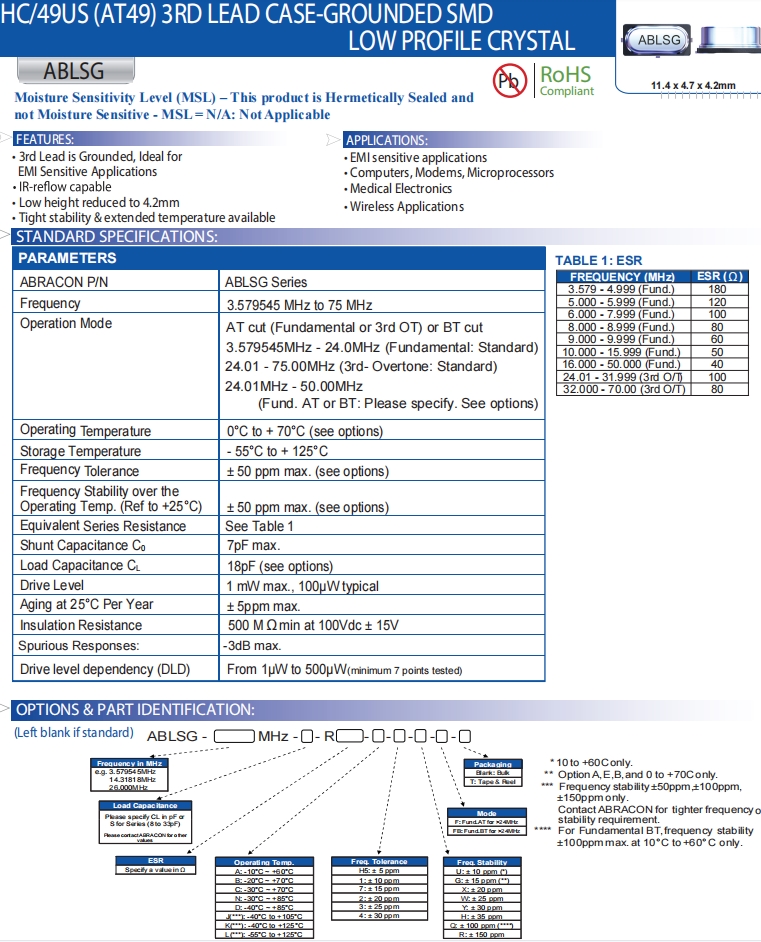 | ABLSG-4.000MHZ-D2Y-T | Abracon晶振 | ABLSG | MHz Crystal | 4MHz |