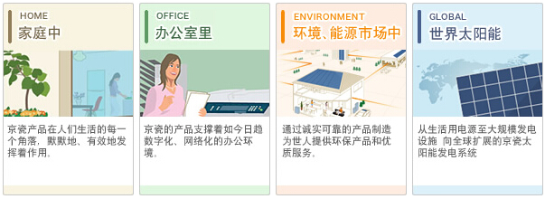 家庭、辦公室、社區乃至世界各地,京瓷的產品已成為我們生活中不可或缺的一部分.例如,將太陽光轉換成清潔能源的住宅用太陽能發電系統;用于打印機、復印機、電腦等辦公室里各種通信設備相關業務的電子零部件;豐富社區溝通的京瓷通信設備相關業務等,尤其,京瓷新開發的能源管理系統可以有效控制電耗.從無電地區到大型太陽能發電站,京瓷的太陽能發電系統產生的清潔能源發揮著積極重要的作用.京瓷將通過各種高品質產品,為提高人們的生活水平做出貢獻.