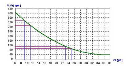 石英晶體共振子應用在并聯振蕩線路上, 振蕩頻率與負載電容CL有很大的關系. 這在前面的公式(3)就可以看到. 圖是以并聯振蕩線路上FL頻率對負載電容CL的變化曲線示意圖. 頻率的“牽引率”指的是負載電容CL1的頻率FL1到負載電容CL2的頻率FL2的頻率變化. 在圖中可以是FL1(CL=24pF)與FL2(CL=10pF)的頻率變化值. 在這個例子中的頻率牽引率是 220 ppm. 若我們將CL1與CL2的負載電容值趨近極小化(曲線作數學上的微分), 就會得到曲線的切線值. 這個切線值就是用某一個負載電容的敏感度( trim sensitivity ).