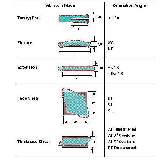 "TG-5021CE-38N 39.0000M3", 經由不同的石英切割角度及不同電極型狀的電場效應, 石英芯片展現了各種不同的振動模態. 以經常產生的振動模態可以概分為擾曲模態(flexure mode), 伸縮模態(extension mode), 面剪切模態(face shear mode) 和 厚度剪切模態(thickness shear mode). 這幾種振動模態以簡單的方法在表一中可以看到. 在實際狀況中, 石英芯片并不是一定祇有單一種振動模態, 而可能有多種模態同時存在在一個石英芯片的振蕩中, 經由適當的設計, 可以壓制其它不希望產生的振動模態(unwanted mode), 來達到主要振動模態的最佳化.