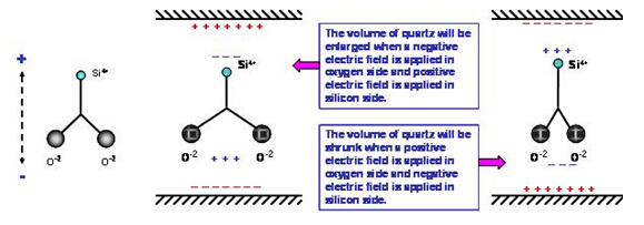 石英材料中的二氧化硅分子(SiO2) 在正常狀態(tài)下, 其電偶極是互相平衡的電中性. 在圖的二氧化硅是以二維空間的簡化圖形. 當(dāng)我們在硅原子上方及氧原子下方分別給予正電場及負(fù)電場時, 空間系統(tǒng)為了維持電位平衡, 兩個氧原子會相互排斥, 在氧原子下方形成一個感應(yīng)正電場區(qū)域, 同時在硅原子上方產(chǎn)生感應(yīng)負(fù)電場區(qū)域. 相反的情況, 當(dāng)我們在硅原子上方及氧原子下方分別給予負(fù)電場及正電場時, 兩個氧原子會相互靠近, 氧原子下方產(chǎn)生感應(yīng)負(fù)電場,硅原子上方產(chǎn)生感應(yīng)正電場. 然而, 氧原子的水平位置變化時, 鄰近的另一個氧原子會相對的產(chǎn)生排斥或吸引的力量, 迫使氧原子回到原來的空間位置. 因此, 電場的力量與原子之間的力量會相互牽動, 電場的改變與水平方向的形變是形成交互作用狀態(tài). 這個交互作用會形成一個在石英材料耗能最小的振動狀態(tài), 祇要由電場持續(xù)給與能量, 石英材料就會與電場之間維持一個共振的頻率. 這個壓電效應(yīng)下氧原子的振幅與電場強(qiáng)度及電場對二氧化硅的向量角度有相對應(yīng)的關(guān)系.在實(shí)際的應(yīng)用上, 電場是由鍍在石英芯片上的金屬電極產(chǎn)生, 電場與二氧化硅的向量角度則是由石英晶棒的切割角度來決定.