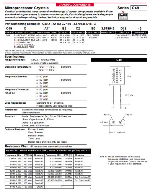| C49X-A3B1C1-40-8.0D16 | Cardinal晶振 | C49 | 8MHz | 16pF | ±100ppm | 40 Ohm | -55°C ~ 125°C |