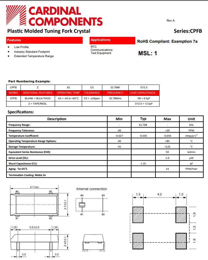 | CPFBZ-A2C5-32.768KD12.5 | Cardinal晶振 | CPFB | 32.768kHz | 12.5pf | 20ppm | 50 kOhm | -40°C ~ 85°C |