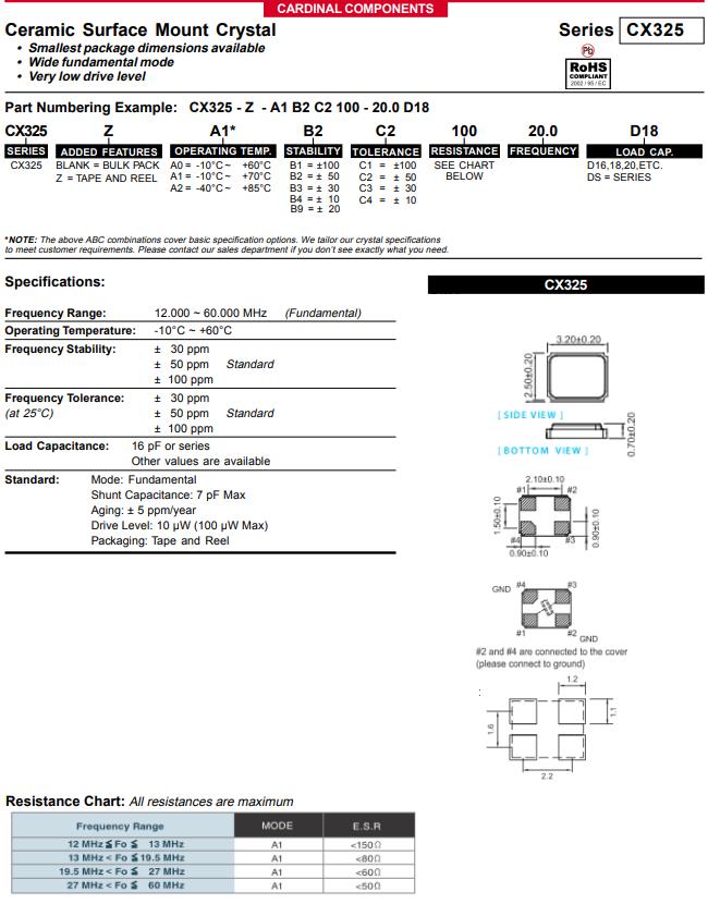 Cardinal晶振,CX325Z-A5B2C5-50-16.0D18,6G常用晶振參數(shù)表