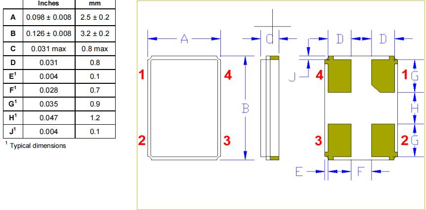 Cardinal晶振,CX325Z-A5B2C5-50-16.0D18,6G常用晶振尺寸圖