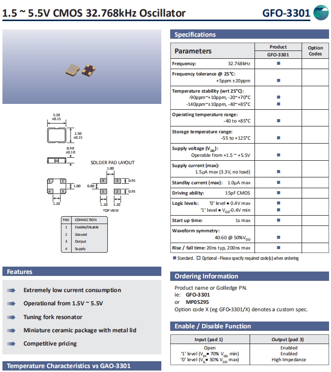Golledge晶振,GFO-3301晶振,時(shí)鐘晶體振蕩器.小體積貼片時(shí)鐘晶體諧振器,是貼片音叉晶體,千赫頻率元件,應(yīng)用于時(shí)鐘模塊,智能手機(jī),導(dǎo)航定位系統(tǒng),因產(chǎn)品本身體積小,貼片編帶型,可應(yīng)用于高性能自動(dòng)貼片焊盤(pán),被廣泛應(yīng)用到各種小巧的便攜式消費(fèi)電子數(shù)碼時(shí)間產(chǎn)品,環(huán)保性能符合ROHS/無(wú)鉛認(rèn)證.