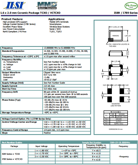 ILSI晶振,I589晶振,TCXO晶振.貼片石英晶振,體積小,焊接可采用自動貼片系統,產品本身小型,表面貼片晶振,特別適用于有小型化要求的電子數碼產品市場領域,因產品小型,薄型優勢,耐環境特性,包括耐高溫,耐沖擊性等,在移動通信領域得到了廣泛的應用,晶振產品本身可發揮優良的電氣特性,滿足無鉛焊接的高溫回流溫度曲線要求.