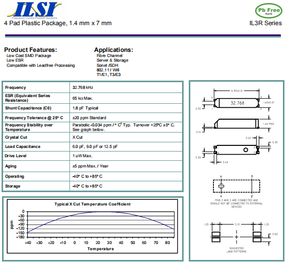 ILSI晶振,IL3R晶振,7015石英晶體諧振器.32.768K時鐘晶體具有小型,薄型,輕型的貼片晶振表面音叉型晶體諧振器,產品具有優良的耐熱性,耐環境特性,可發揮晶振優良的電氣特性,符合RoHS規定,滿足無鉛焊接的高溫回流溫度曲線要求,金屬外殼的封裝使得產品在封裝時能發揮比陶瓷諧振器外殼更好的耐沖擊性.
