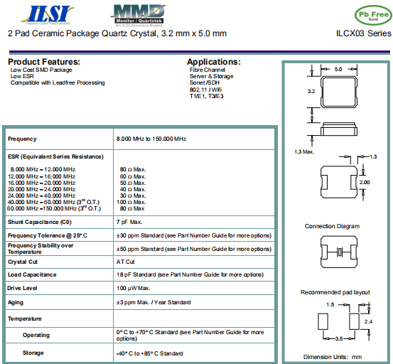 ILSI晶振,ILCX03晶振,無鉛環保晶振.產品具有高精度晶振超小型的表面貼片型石英晶體振蕩器,最適用于移動通信終端的基準時鐘等移動通信領域.比如智能手機,無線通信,衛星導航,平臺基站等較高端的數碼產品,晶振本身小型,薄型具備各類移動通信的基準時鐘源用頻率,貼片晶振具有優良的電氣特性,耐環境性能適用于移動通信領域,滿足無鉛焊接的高溫回流溫度曲線要求.