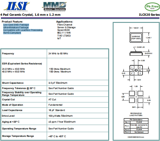 ILSI晶振,ILCX20晶振,高性能石英晶體.小型表面貼片晶振型,是標準的石英晶體諧振器,適用于寬溫范圍的電子數(shù)碼產(chǎn)品,家電電器及MP3,MP4,播放器,單片機等領域.可對應24.000MHz以上的頻率,在電子數(shù)碼產(chǎn)品,以及家電相關電器領域里面發(fā)揮優(yōu)良的電氣特性,滿足無鉛焊接的回流溫度曲線要求.