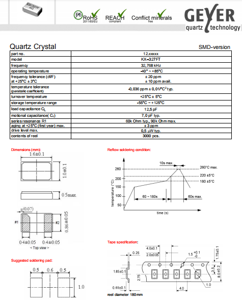 Geyer晶振,KX-327FT晶振,石英晶體諧振器.小體積SMD時鐘晶體諧振器,是貼片音叉晶體,千赫頻率元件,應用于時鐘模塊,智能手機,全球定位系統(tǒng),因產(chǎn)品本身體積小,SMD編帶型,可應用于高性能自動貼片焊接,被廣泛應用到各種小巧的便攜式消費電子數(shù)碼時間產(chǎn)品,環(huán)保性能符合ROHS/無鉛標準.