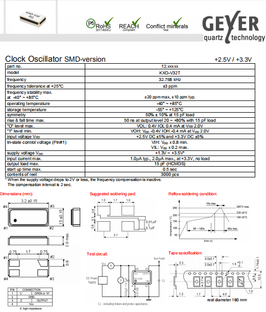 Geyer晶振,KXO-V32T晶振,時(shí)鐘晶體振蕩器.有源晶振,是只晶體本身起振需要外部電壓供應(yīng),起振后可直接驅(qū)動(dòng)CMOS 集成電路,產(chǎn)品本身已實(shí)現(xiàn)與薄型IC(TSSOP封裝,TVSOP封裝)同樣的1mm厚度,斷開(kāi)時(shí)的消費(fèi)電流是15 µA以下,編帶包裝方式可對(duì)應(yīng)自動(dòng)搭載及IR回流焊接(無(wú)鉛對(duì)應(yīng))產(chǎn)品有幾種電壓供選1.8V,2.5V,3V3.3V,5V,以應(yīng)對(duì)不同IC產(chǎn)品需要.