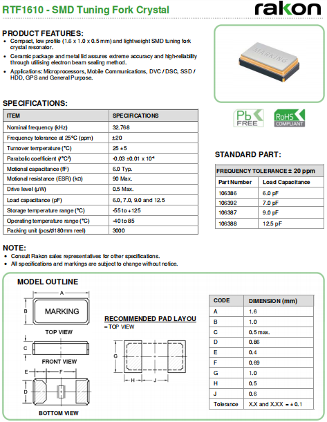 Rakon晶振,RTF1610晶振,音叉石英晶體.超小型,薄型,質(zhì)地輕的表面貼片音叉型晶體諧振器,手機(jī)晶體,產(chǎn)品體積小,特別適用于各種小巧的便攜式消費(fèi)電子數(shù)碼產(chǎn)品,在移動(dòng)通信領(lǐng)域得到了廣泛的應(yīng)用,貼片晶振產(chǎn)品本身可發(fā)揮優(yōu)良的電氣特性,滿(mǎn)足無(wú)鉛焊接的高溫回流溫度曲線(xiàn)要求.