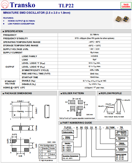 Transko晶振,TLP22晶振,貼片有源晶振.有源晶振,是只晶體本身起振需要外部電壓供應(yīng),起振后可直接驅(qū)動CMOS 集成電路,產(chǎn)品本身已實現(xiàn)與薄型IC(TSSOP封裝,TVSOP封裝)同樣的1mm厚度,斷開時的消費電流是15 µA以下,編帶包裝方式可對應(yīng)自動搭載及IR回流焊接(無鉛對應(yīng))產(chǎn)品有幾種電壓供選1.8V,2.5V,3V3.3V,5V,以應(yīng)對不同IC產(chǎn)品需要.