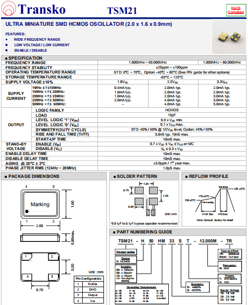 Transko晶振,TSM21晶振,低抖動石英振蕩器.智能手機晶振,產品具有高精度超小型的表面貼片型石英晶體振蕩器,最適用于移動通信終端的基準時鐘等移動通信領域.比如智能手機,無線通信,衛星導航,平臺基站等較高端的數碼產品,晶振本身小型,薄型具備各類移動通信的基準時鐘源用頻率,貼片晶振具有優良的電氣特性,耐環境性能適用于移動通信領域,滿足無鉛焊接的高溫回流溫度曲線要求.