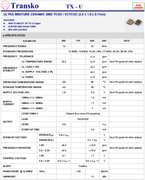 Transko晶振,TX-U晶振,溫度補(bǔ)償晶振.貼片晶振本身體積小,超薄型石英晶體振蕩器,特別適用于有目前高速發(fā)展的高端電子數(shù)碼產(chǎn)品,因?yàn)榫д癖旧硇⌒突枨蟮氖袌鲱I(lǐng)域,小型,薄型是對應(yīng)陶瓷振蕩器(偏差大)和普通的石英晶體振蕩器(偏差小)的中間領(lǐng)域的一種性價(jià)比較出色的產(chǎn)品.產(chǎn)品廣泛用于筆記本電腦,無線電話,衛(wèi)星導(dǎo)航HDD, SSD, USB, Blu-ray等用途,符合無鉛焊接的高溫回流焊曲線特性.