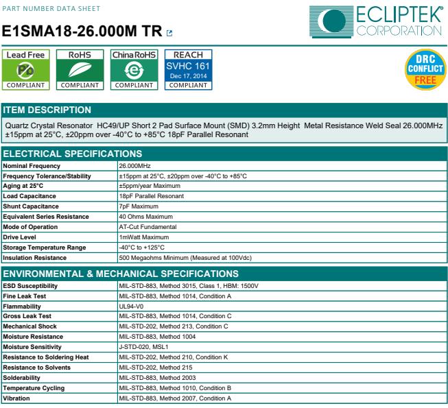 所有石英晶體諧振器和實時時鐘模塊都以IC形式提供.ECLIPTEK日蝕晶振,E1SMA18-26.000M-TR高品質晶振,石英晶體諧振器.