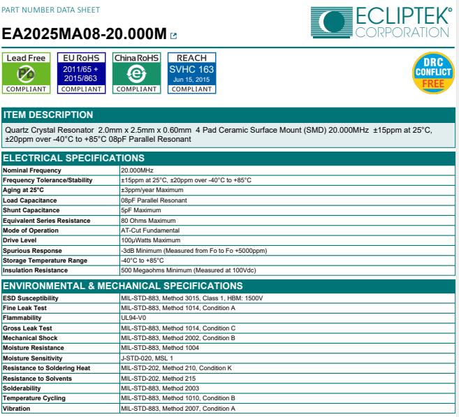 所有石英晶體諧振器和實時時鐘模塊都以IC形式提供.ECLIPTEK日蝕晶振,EA2025MA08-20.000M晶振,低損耗晶振.
