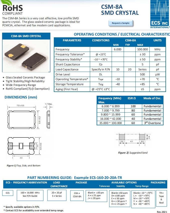 ECS-200-20-20A-TR\CSM-8A\20兆赫茲\7050mm\SMD晶體,尺寸7050mm,頻率為20MHZ,ECS晶振,美國伊西斯晶振,石英貼片晶振,進口無源諧振器,SMD晶體,石英晶體,石英晶體諧振器,音叉晶體,高質(zhì)量晶振,低損耗晶振,7050mm貼片晶振,無線設備晶振,智能家居晶振,CSM-8A系列是一款非常具有成本效益的低規(guī)格貼片石英晶體。