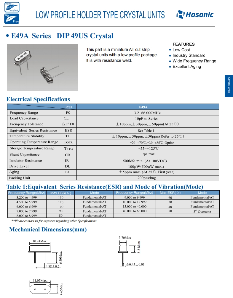 | E49A20E00000ME | Hosonic晶振 | E49A | 20 MHz | 20 pF | ±30 ppm | ±30 ppm |