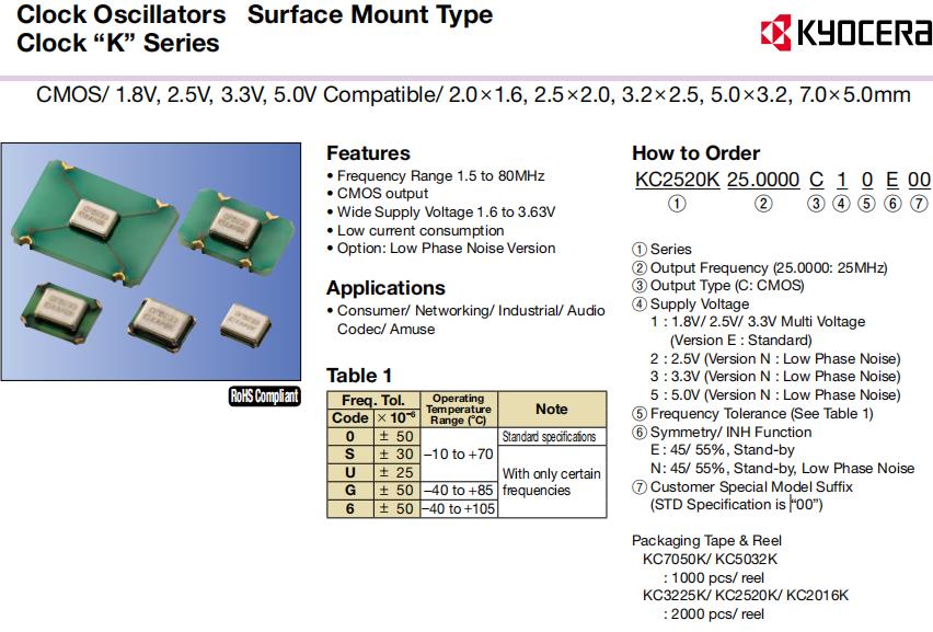 | KC2520K25.0000C10E00 | Kyocera有源振蕩器 | KC2520K, Kyocera | 25MHz | 1.6 V ~ 3.63 V | -10°C ~ 70°C |