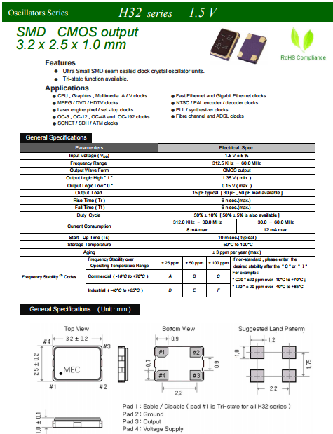 MERCURY晶振,3225貼片晶振,H32石英水晶振蕩子.3225mm體積非常小的SMDcrystal器件,是民用小型無線數碼產品的最佳選擇,小體積的晶振被廣泛應用到,手機藍牙,GPS定位系統,無線通訊集,高精度和高頻率的穩定性能,非常好的減少電磁干擾的影響,是民用無線數碼產品最好的選擇,符合RoHS/無鉛.