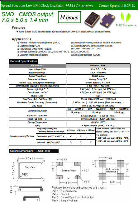MERCURY晶振,臺(tái)產(chǎn)有源晶振,HM572R時(shí)鐘晶體振蕩器.貼片式石英晶體振蕩器,低電壓?jiǎn)?dòng)功率,并且有多種電壓供選擇,比如有1.8V,2.5V,3.3V,3.8V,5V等,產(chǎn)品被廣泛應(yīng)用于,平板筆記本,GPS系統(tǒng),光纖通道,千兆以太網(wǎng),串行ATA,串行連接SCSI,PCI-Express的SDH / SONET發(fā)射基站等領(lǐng)域.符合RoHS/無鉛.