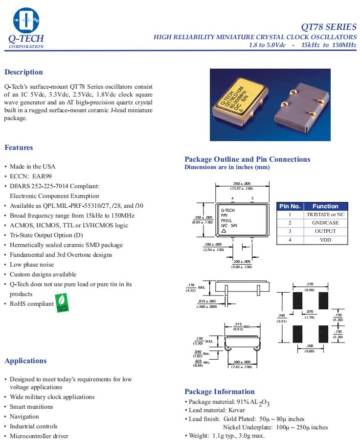 QT78HCD11M-75.000MHz|6G發射器晶振|低相位噪聲晶振, Q-Tech美國晶振,QT78有源晶振,QT78HCD11M-75.000MHz晶振,進口貼片晶振,石英晶體振蕩器,低相位噪聲晶振,頻率75MHz,工作溫度-40~85°C,電壓5V,頻率穩定性50ppm,基頻和第三泛音設計,耐高溫晶振,無鉛環保晶振,6G發射器晶振,軍用時鐘應用晶振, 智能彈藥應用晶振,工業控制應用晶振,微控制器驅動器應用晶振.