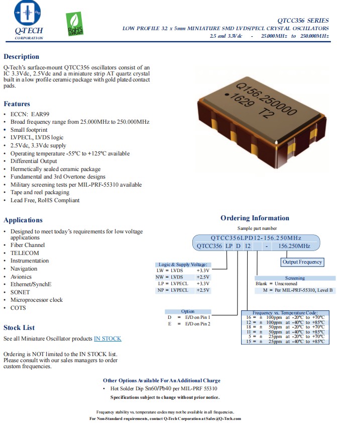 QTCC356LWD12-125.000MHz,LVDS差分晶振,6G以太網(wǎng)晶振 ,Q-TECH歐美晶振,QTCC356石英晶體振蕩器,QTCC356LWD12-125.000MHz晶振,頻率125MHz,電壓3.3V,工作溫度-40~85°C,頻率穩(wěn)定性100ppm,耐高溫晶振,LVDS差分晶振,無鉛環(huán)保晶振,光纖通道晶振,電信晶振,儀器設備晶振,GPS導航晶振,航空電子設備晶振,6G以太網(wǎng)晶振,微處理器時鐘應用晶振.