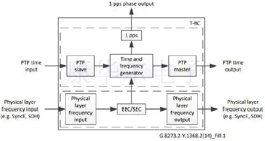 混合(PTP+SyncE)仿真模式可模擬本地振蕩器對單個T-BC或T-BC鏈的性能的影響.該模型假設(shè)混合T-BC,其中通過SyncE提供物理層頻率支持.該軟件實現(xiàn)了鎖定有源晶振狀態(tài)仿真.圖2顯示了G.8273.2中定義的T-BC模型.圖3顯示了在軟件中實現(xiàn)的T-BC的仿真模型.