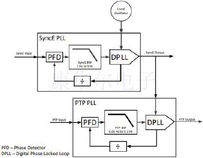 在這樣的同步系統(tǒng)中,每個網(wǎng)絡(luò)節(jié)點上都有一個本地振蕩器,它提供了時鐘到同步的鎖相環(huán)(PLL).取決于實現(xiàn)方式,PLL環(huán)路帶寬通常設(shè)置在1mHz至0.1Hz的范圍內(nèi).許多因素都會影響時間誤差性能.本地振蕩器的穩(wěn)定性是導致節(jié)點中產(chǎn)生時間誤差的主要因素.PLL濾波功能(PLL環(huán)路階數(shù),PLL環(huán)路帶寬)和輸入信號中的漂移量也是影響因素.