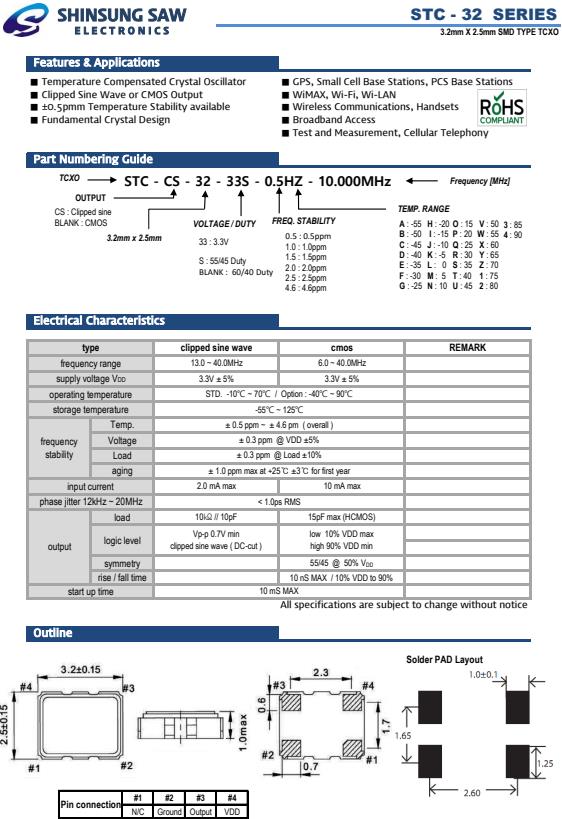 韓國(guó)新松晶振,STC-32溫度補(bǔ)償晶體振蕩器,STC-CS-32-33S-0.5HZ-16.000MHz晶振,小型SMD有源晶振,從最初超大體積到現(xiàn)在的7050mm,6035mm,5032mm,3225mm,2520mm體積,有著翻天覆地的改變,體積的變小也使產(chǎn)品帶來了更高的穩(wěn)定性能,接縫密封石英晶體振蕩器,精度高,覆蓋頻率范圍寬的特點(diǎn),SMD高速自動(dòng)安裝和高溫回流焊設(shè)計(jì),Optionable待機(jī)輸出三態(tài)輸出功能,電源電壓范圍:1.8V~5V,高穩(wěn)定性,低抖動(dòng),低功耗,主要應(yīng)用領(lǐng)域:無線通訊,高端智能手機(jī),平板筆記本W(wǎng)LAN,藍(lán)牙,數(shù)碼相機(jī),DSL和其他IT產(chǎn)品的晶振應(yīng)用,三態(tài)功能,PC和LCDM等高端數(shù)碼領(lǐng)域,符合RoHS/無鉛.