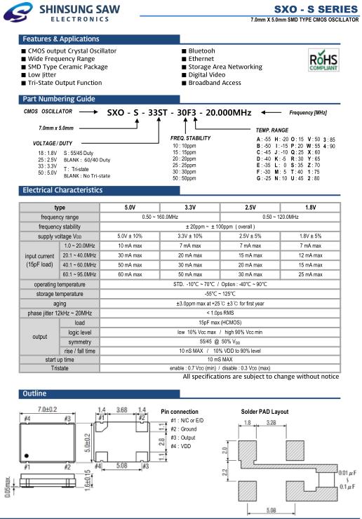 新松晶振,SXO-S藍牙有源晶振,SXO-S-33ST-30F3-20.000MHz晶振,小型SMD有源晶振,從最初超大體積到現在的7050mm,6035mm,5032mm,3225mm,2520mm體積,有著翻天覆地的改變,體積的變小也使產品帶來了更高的穩定性能,接縫密封石英晶體振蕩器,精度高,覆蓋頻率范圍寬的特點,SMD高速自動安裝和高溫回流焊設計,Optionable待機輸出三態輸出功能,電源電壓范圍:1.8V~5V,高穩定性,低抖動,低功耗,主要應用領域:無線通訊,高端智能手機,平板筆記本WLAN,藍牙,數碼相機,DSL和其他IT產品的晶振應用,三態功能,PC和LCDM等高端數碼領域,符合RoHS/無鉛.