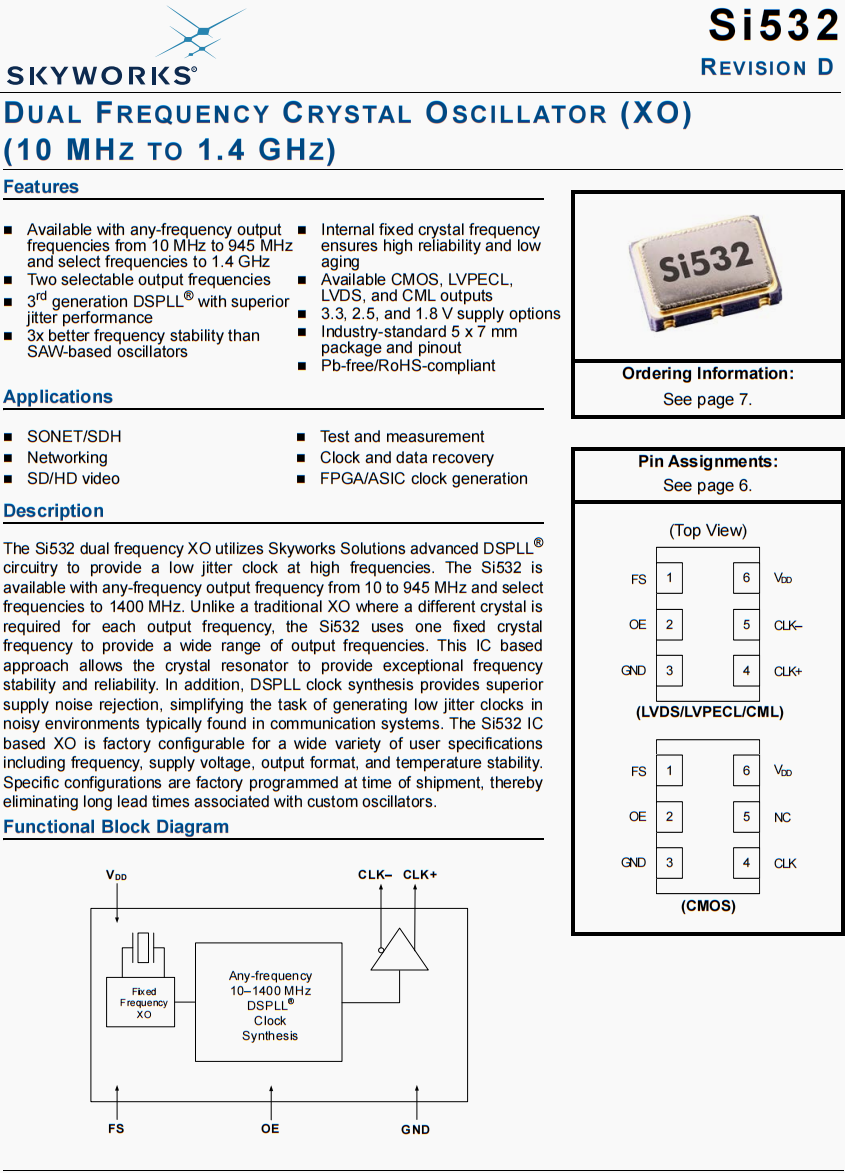 | 569DABA001908BBG | Skyworks晶振 | Ultra™ Si569 | VCXO | 1.28127409 GHz | CML | 1.8V, 2.5V, 3.3V | ±20ppm |