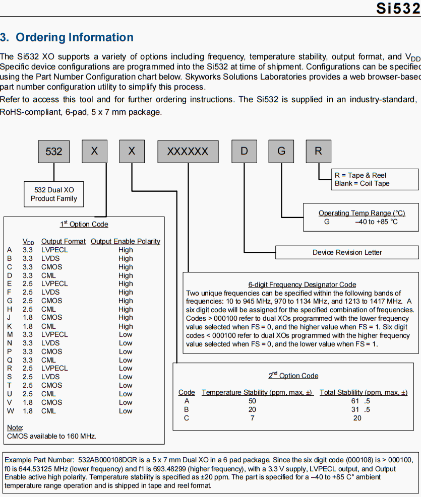 | Skywork原廠編碼 | 生產商 | 型號 | 類型 | 頻率 | 輸出 | 電源電壓 | 頻率穩定度 |