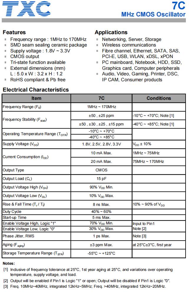 | 7C-20.000MBB-T | TXC晶振 | 7C | XO (Standard) | 20MHz | ±50ppm | -10°C ~ 70°C |