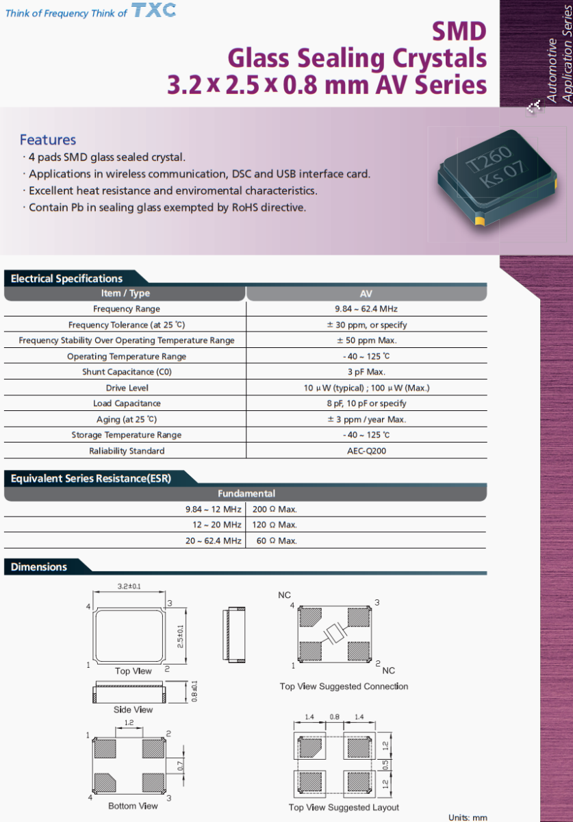 | AV-25.000MAPQ-T | TXC晶振 | AV | 25MHz | ±50ppm | ±30ppm | 10pF |