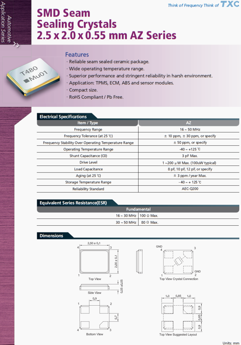 TXC晶振,無鑰匙進入模塊晶振,AZ-37.400MEIQ-T晶振,臺灣TXC晶振公司,晶技晶振,AZ系列SMD接縫,密封晶體,2.5 x 2.0 x 0.55 mm ,特點,可靠的接縫密封陶瓷封裝。工作溫度范圍寬。性能優越,在惡劣環境下具有嚴格的可靠性。應用范圍:TPMS, ECM, ABS,傳感器模塊。.ompact大小。符合rohs標準/不含鉛,臺灣晶振,進口晶振,四腳晶振,無源晶振,網絡設備晶振,汽車晶振,高品質晶振,汽車氛圍燈晶振,大燈控制器晶振,小尺寸晶振,耐高溫晶振,
