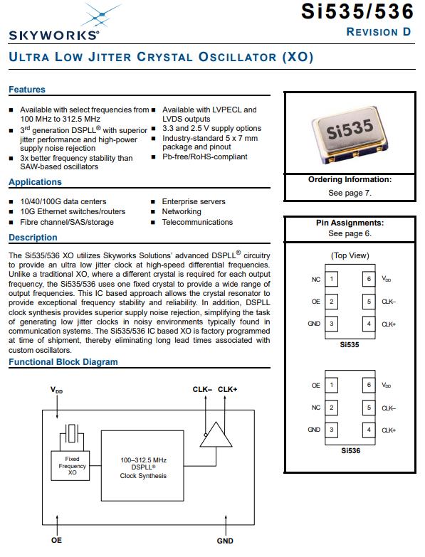 編碼501AAA27M0000CAF,Si535/536 XO時鐘晶體振蕩器,采用了Skyworks Solutions先進的DSPLL電路以在高速差分頻率下提供超低抖動時鐘。不像傳統的XO,每個輸出需要不同的晶體頻率,Si535/536使用一個固定晶體來提供寬范圍的輸出頻率。這種基于IC的方法允許晶體諧振器提供卓越的頻率穩定性和可靠性。此外,DSPLL時鐘合成提供出色的電源噪聲抑制,簡化了任務在高噪聲環境中產生低抖動時鐘,通常出現在通信系統。