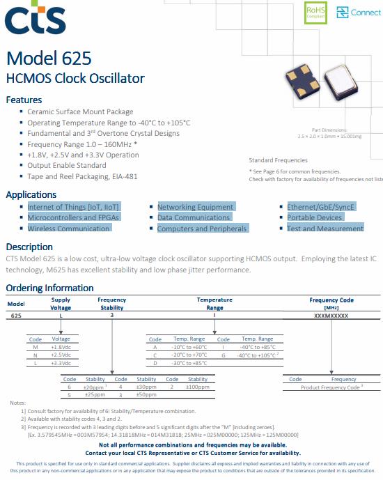 更多>>編碼625M3I020M00000是CTS公司最新IC技術(shù)的超低電壓時鐘晶體振蕩