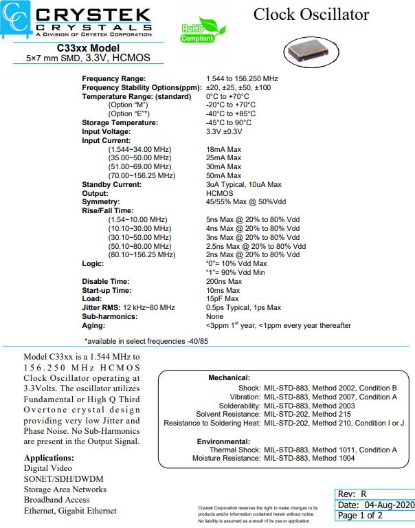 | CE3390-33.000 | CRYSTEK晶振 | C33 | Active | XO (Standard) | 33MHz | ±100ppm | -40°C ~ 85°C |