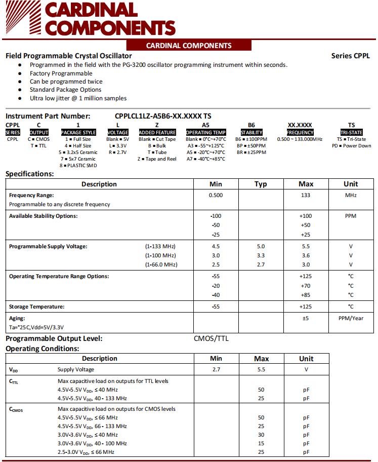 Cardinal低抖動的XO振蕩器編碼CPPLC5-A7BR-25.0TS常用于高速通信和基站,SPXO振蕩器產品特點:
