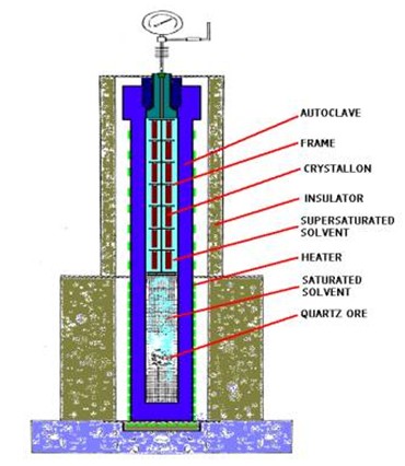 高品質的天然石英晶體數(shù)量有限,而且價格很高,這就促使了合成石英制造業(yè)的發(fā)展。合成石英晶體在垂直的高壓釜里生產,高壓釜以水熱法的原理工作,溫度大約為400℃,壓力為1000個大氣壓左右。籽晶放在高壓釜上部,天然石英原料被放在下部。升溫加壓的時候,高壓釜內的溶液呈堿性。高壓釜的加熱裝置,在容器內部制造出上部比下部溫度低的環(huán)境。這個溫度梯度造成溶解了底部天然石英的堿性溶液的對流,而且使天然石英沉積在頂部的籽晶片上。就是用這種方法生產,它可以在幾星期內長好幾百克。如果在溫度達到573℃的時候,α石英將相變成β石英(失去壓電特性)。