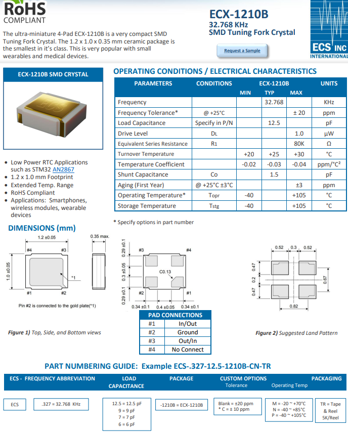超小型32.768K音叉晶體ECS-.327-12.5-1210B-CN-TR是可穿戴設備的理想選擇