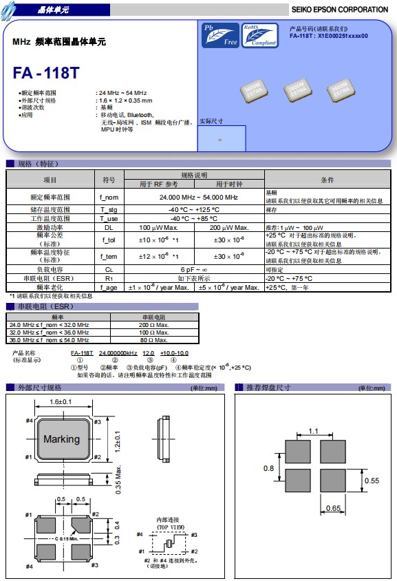 日本愛普生晶振FA-118T,是一款超小型尺寸1.6x1.2mm石英晶體諧振器,頻率范圍:24MHz至54MHz,無源晶振,工作溫度范圍-40℃至+85℃,具有超小型,輕薄型,耐熱及耐環境特性,隨著民生用市場中可無線通信產品的發展和迅速普及,搭載近距離無線通信Bluetooth功能的產品逐漸增加,FA-118T貼片晶振是當今深受廣大客戶歡迎的小尺寸晶振,被廣泛用于隨身攜帶設備,可穿戴設備,移動電話,無線-局域網,智能手機,平板電腦,數碼電子等領域。