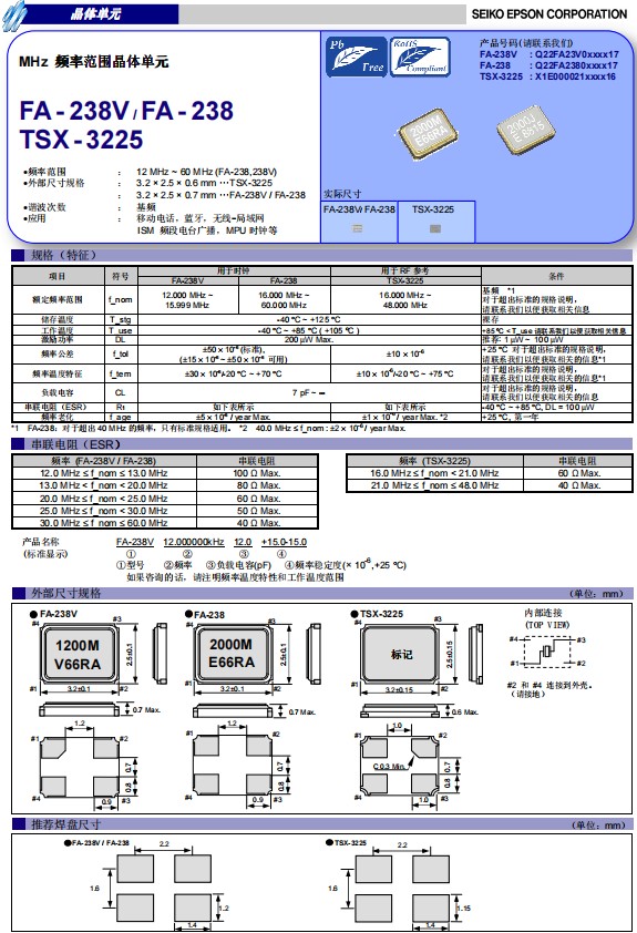 愛普生晶振FA-238是一款小體積尺寸3.2x2.5mm無源晶振,石英晶體諧振器,四腳貼片晶振,頻率范圍16MHz至60MHz,工作溫度-40℃至+85℃(+105℃),具有超小型,輕薄型,耐熱,耐振,耐沖擊等優良的耐環境特性。特別適用于小型便捷式移動通訊,可穿戴設備,智能手機,平板電腦,便捷式電子儀器,汽車電子,智能家居等。