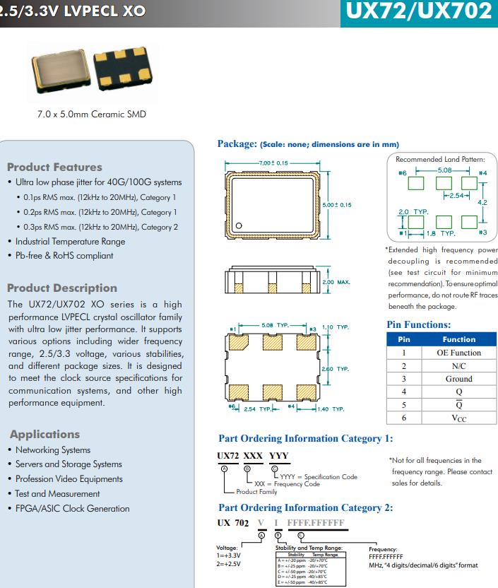 UX72/UX702 XO系列是高性能優良的LVPECL時鐘晶體振蕩器家族具有超低抖動性能。它支持多種選擇,包括更廣泛的頻率量程,2.5/3.3電壓,各種穩定性,以及不同的包裝尺寸。它的目的是的時鐘源規格通訊系統等高設備性能