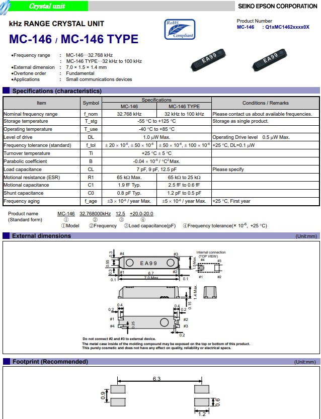 | Q13MC1462000300 | 7x1.5x1.4mm | MC-146 | 32.768kHz | 7pF | +/-10.0ppm | -40 to +85°C |
