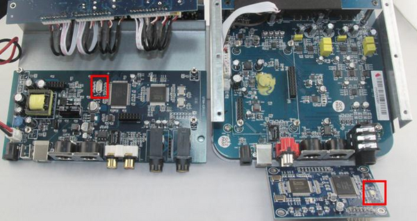 我們把它放大來看一下會(huì)比較清晰一點(diǎn),那現(xiàn)在就能很明顯的看到晶振了,如果不仔細(xì)看,可能會(huì)忽略了這個(gè)小東西, Mobile U沒有Cube 4 nano穩(wěn)定的罪魁禍?zhǔn)拙褪菆D中紅框內(nèi)部分。晶振是聲卡的心臟,穩(wěn)定的跳動(dòng)才不會(huì)出現(xiàn)問題。Mobile U用的晶振是普通的石英晶體諧振器,Cube 4 nano用的是高精度的有源晶振,此晶振分布在聲卡USB和電腦通訊的主控旁邊,晶振的不穩(wěn)定,可能會(huì)造成爆音、失真等問題。